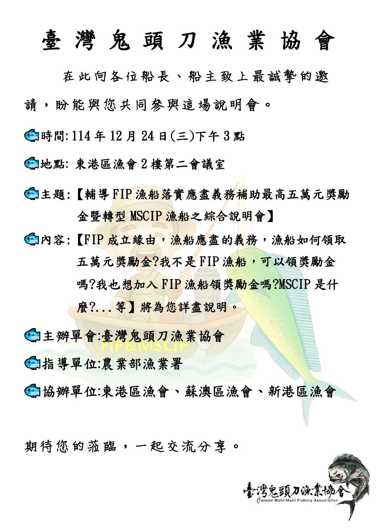 - 主題:【輔導FIP漁船落實應盡義務補助最高五萬元獎勵金暨轉型MSCIP漁船之綜合說明會】